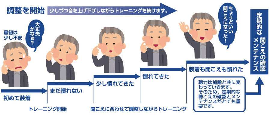 補聴器は装着したらすぐに聞こえるようになるとは限りません。補聴器を使いこなすためには、トレーニングと調整が必要です。